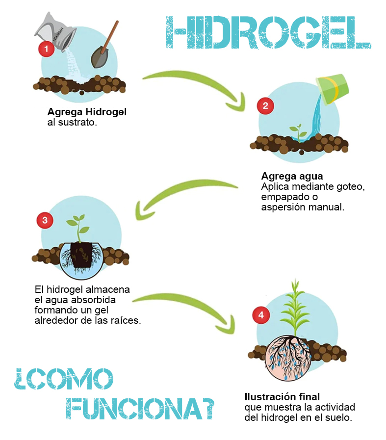 Tiene la capacidad de retener grandes cantidades de agua en su estructura. Este gel se mezcla con el suelo de sus campos de cultivo y actúa como una reserva de agua, liberándola gradualmente a medida que las plantas la necesitan.